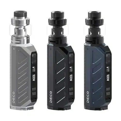 ASPIRE DECO 100W STARTER KIT. Discover the Aspire DECO 100W Starter Kit, featuring a single battery configuration, 1-100W output range, and is paired with the Aspire ODAN EVO Tank. Constructed from durable zinc-alloy, the Aspire DECO is powered by a single high amp battery, utilizing a 21700 or 18650 battery with the included adapter.