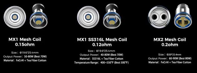 The MX coil platform has five options. When you receive the package, you will see one MX2 0.2ohm mesh coil is already installed. It operates in the range of 60 to 90 watts but is best used at 80 watts. And, there’s also a 0.15ohm MX1 mesh coil included with a 50 to the 80-watt range, but recommended at 70 watts. There are 4 more additional coils, although some have yet to be released.