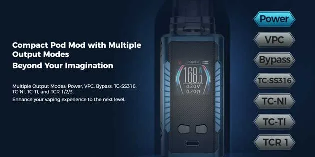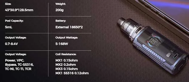 Freemax Maxus Max 168W Mod Kit. Maxus DTL Pod. As of this writing, the Maxus Max is said to be extremely compact for a dual 18650 box mod. In fact, with the pod installed, the measurements come in at only 43mm by 30.9mm by 128.5g and the weight at only 200 grams. This means you could potentially store the kit in your pocket or purse. The 1.3 inches embedded IML screen also perfectly integrates with the overall appearance of the setup. And, customize the UI to four different colors.