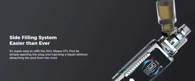 Each pod has a 5ml vape juice reservoir and is refilled via a newly designed side-fill port that is easier to work with. Simply open the plug on the atomizer without removing it from the mod and inject e-liquid. Unlike competing pods with limited or no airflow, the Maxus Max Kit has dual bottom air intake slots that you may freely adjust to your liking.