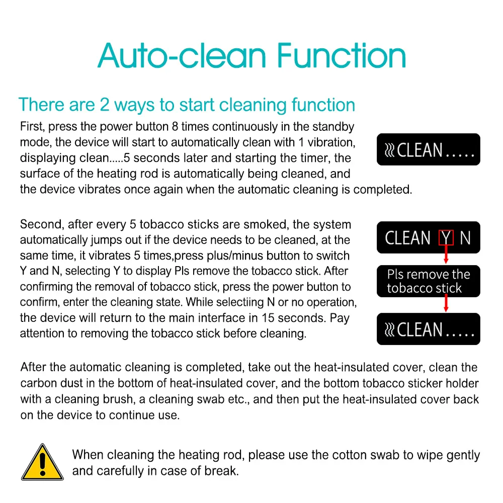Second, the system automatically jumps out if the device needs to be cleaned after every 5 heat sticks are used, at the same time, it vibrates 5 times, press plus/minus button to switch Y and N, SELECTING Y to display. Please remove the tobacco heat stick.