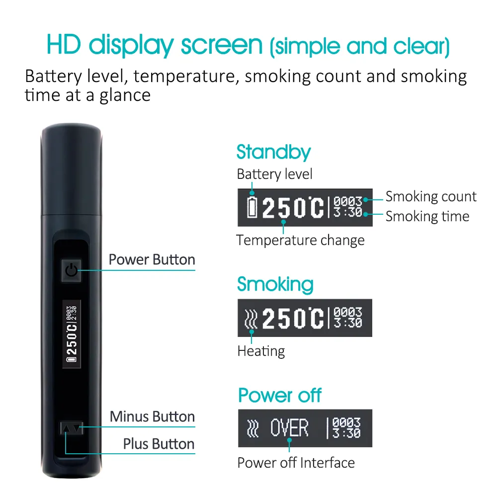 Simple use with OLED display shows battery level、temperature、smoking count and smoking time