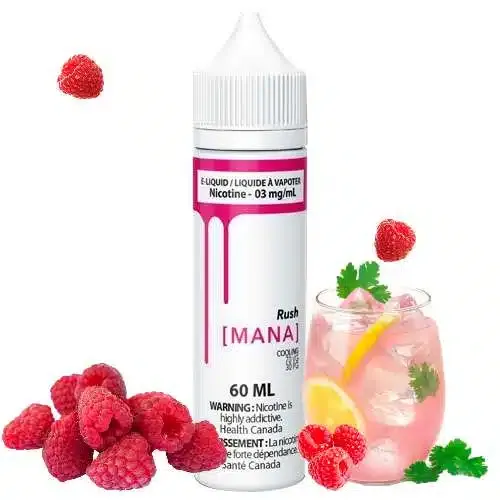 Rush – Mana, This stimulating raspberry-flavoured lemonade experience is the perfect choice for sour e-liquid enthusiasts looking for an all-day-vape that packs a punch! As with any MANA product, its well-measured cooling properties combined with the smoothness of Salt NIX™ are sure to stimulate your taste buds and offer you a breath-taking refreshing experience.