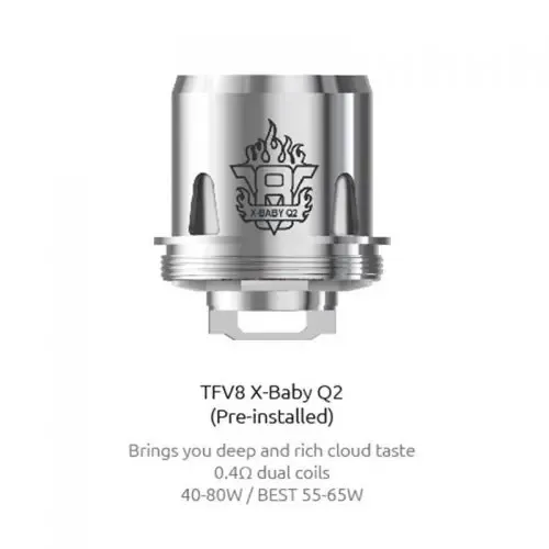 SMOK V8 X-Baby Q2 Replacement Coil, 0.4ohm dual coils, supports 40 – 80W wattage (best for 55-65W), which brings you deep and rich cloud taste. Specially designed for TFV8 X-Baby. Therefore, you must try. Besides, you should stock.