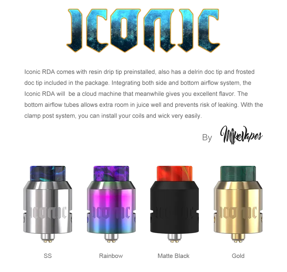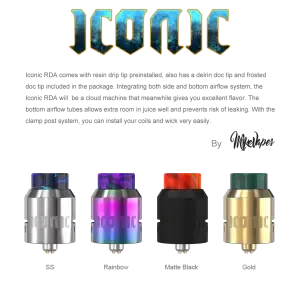 Iconic RDA Atomizer By Vandy Vape an updated version of the beloved Icon series RDA. Integrating the unique design from icon RDA, the Iconic RDA comes with a resin drip tip pre-installed, also has a Delrin doc tip and frosted doc tip included in the package. Integrating both side and bottom airflow systems, the Iconic RDA will be a cloud machine that meanwhile gives you excellent flavor. The bottom airflow tubes allow extra room in the E-juice well and prevent the risk of leaking. With the clamp post system, you can install your coils and wick very easily. Therefore, you should use one.